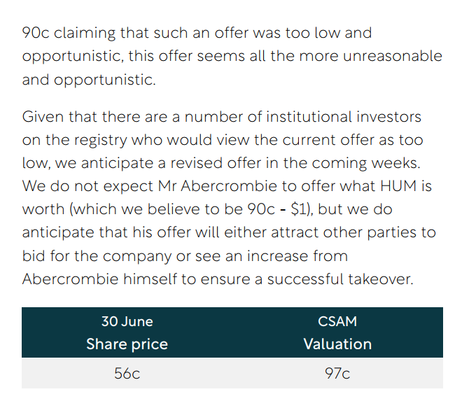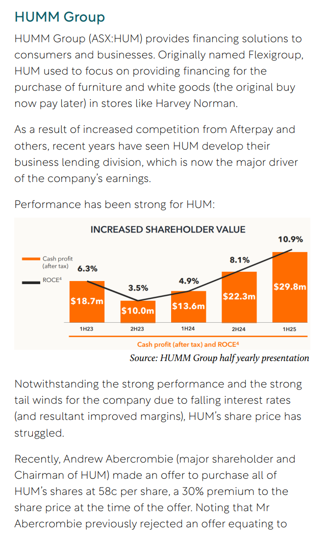 Humm is a functional business trading at half of peer multiples because the Board has operated as Andrew Abercrombie’s personal fiefdom. He blocked value-creating deals, pursued conflicted lowball bids, and buried superior offers. Activists with meaningful stakes are forcing change at their own expense. The plan is straightforward: return lazy balance sheet cash to shareholders, establish normal governance, and let the stock rerate to peer multiples.